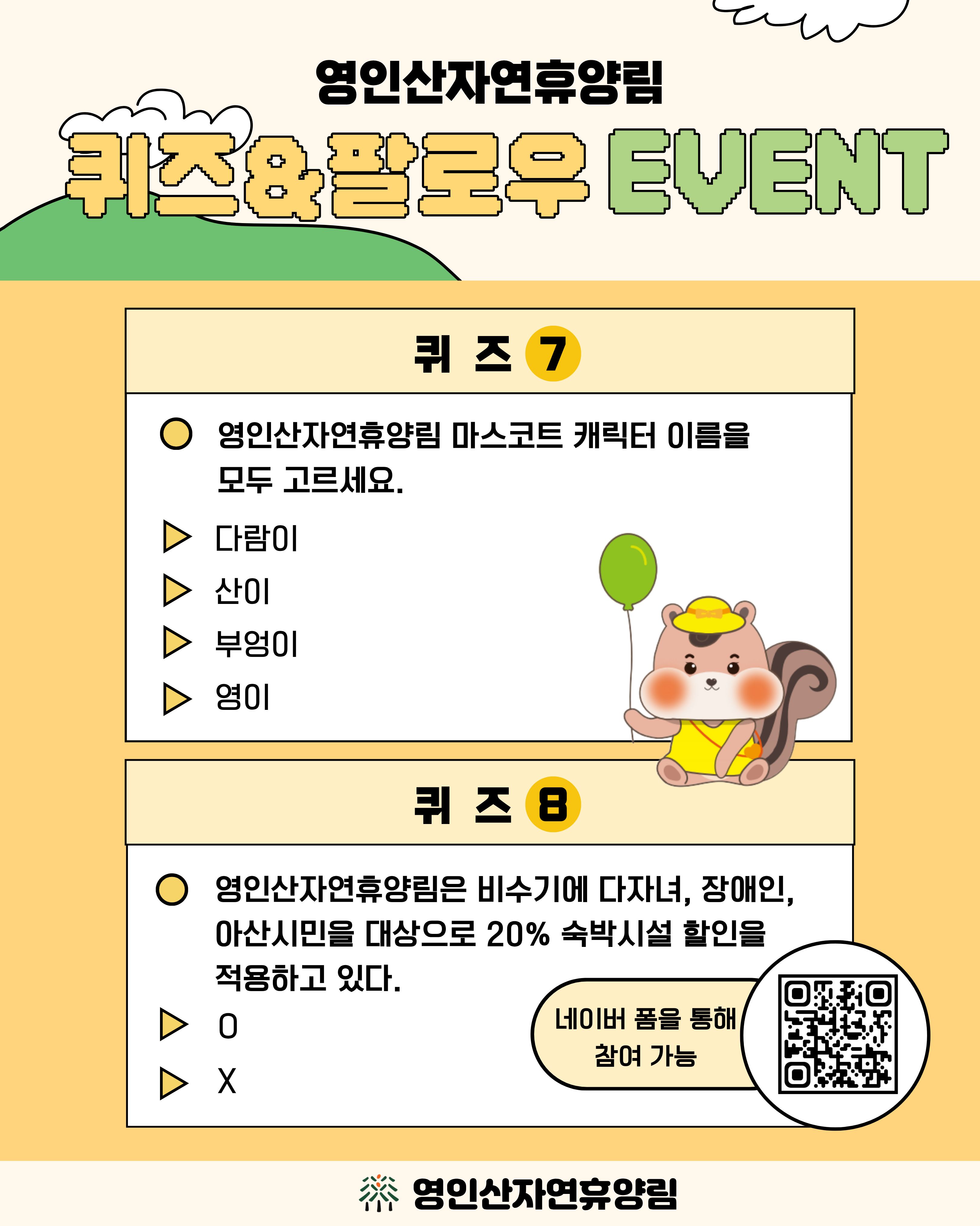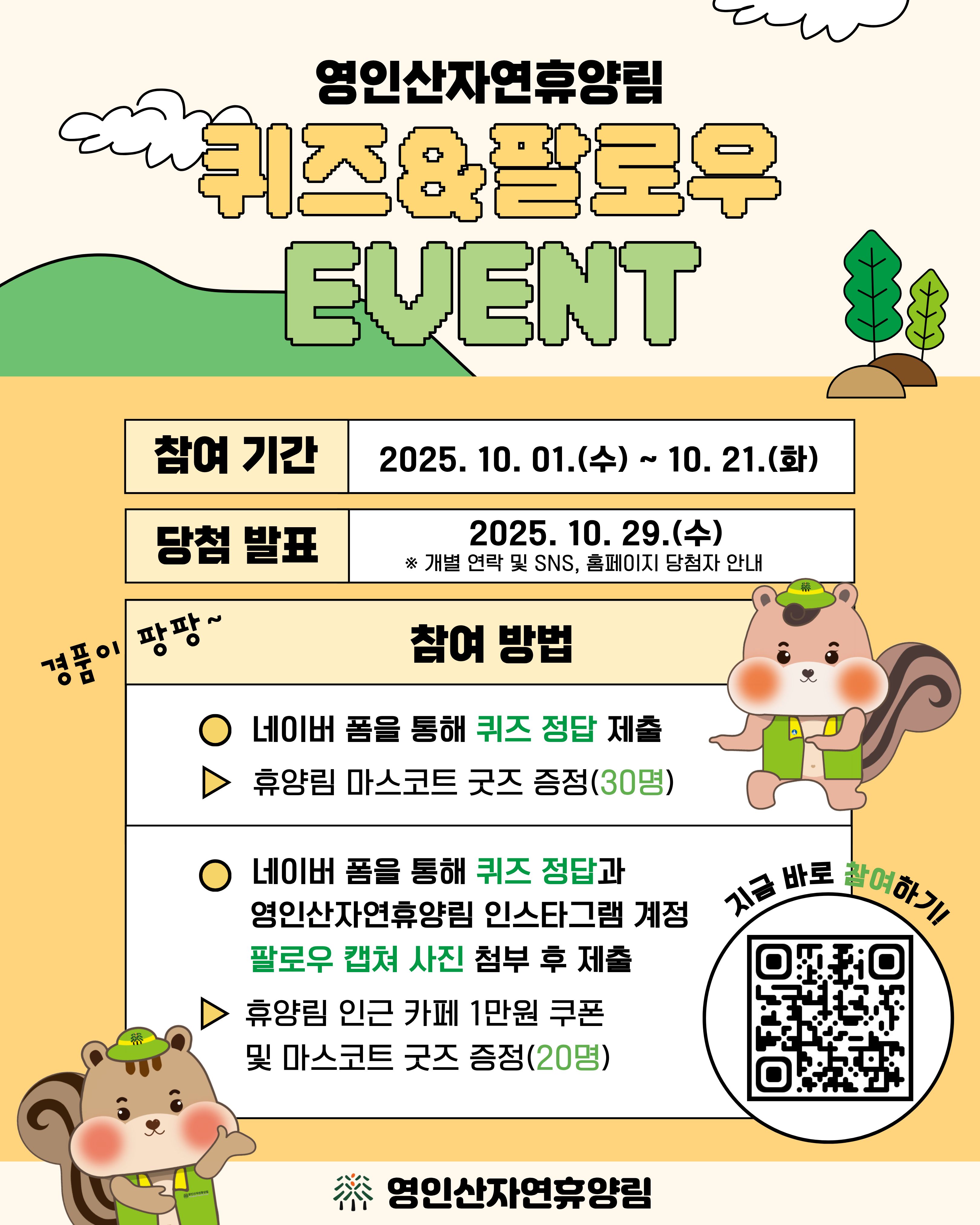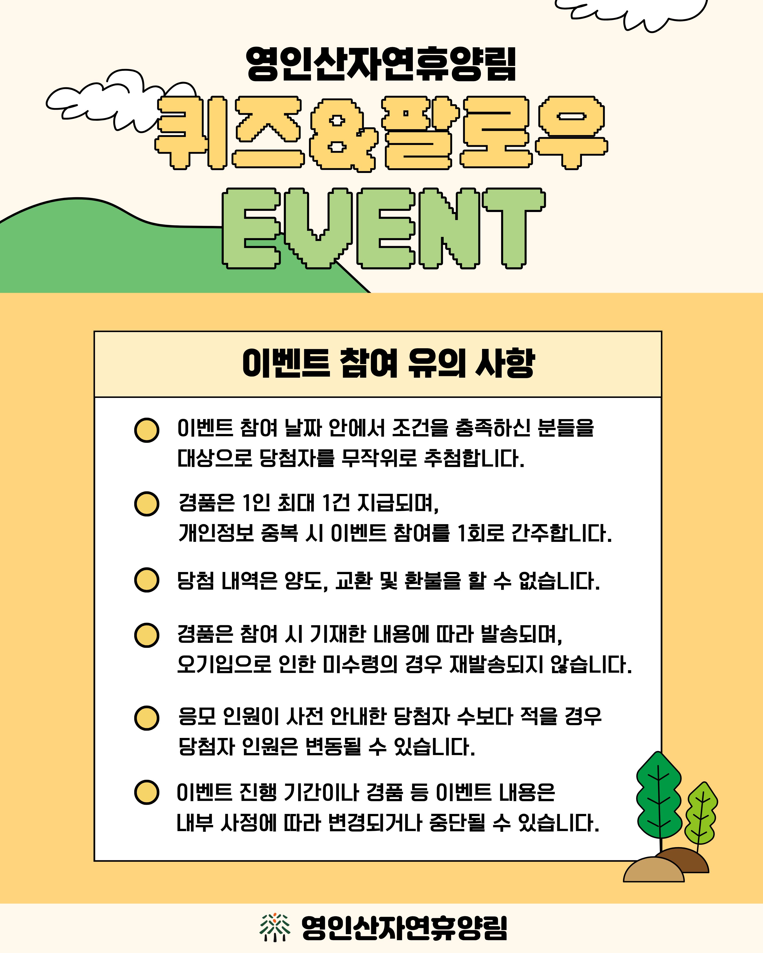 10월 1일부터 10월 21일까지 진행되는 영인산자연휴양림 퀴즈&팔로우 이벤트 안내드립니다.